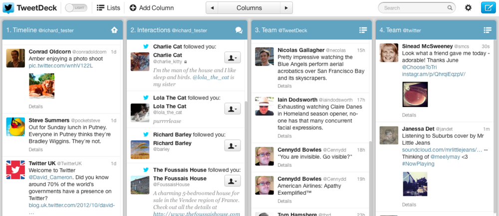TweetDeck by TwitterDeveloper: Twitter, Inc.TweetDeck is a social media platform that allows users to manage multiple Twitter accounts. It not only allows sending and receiving tweets, but also helps monitor different profiles, trends, messages and alerts grouped under specific hashtags. The TweetDeck is an expanded and improved version of Twitter. If uses it to follow a topic or research a subject, the new application will make people who use Twitter will make it more obsessive experience. TweetDeck automatically refreshes the page, so there is not need to click the "Update" button. The news are delivered immediately and filtered under categories representing events, topics and hashtags. Just like in Twitter, the TweetDeck allows users to send 140-character messages and post a link to an image or an article. The TweetDeck is linked to the Tweeter account, so users can log in using their Twitter username and password. The tool can be used both as a web and desktop app. TweetDeck is one of the most popular Twitter applications in 2009 with a 23% market share, according to http://www.sysomos.com. ![]() If I want to monitor messages for retweeting, I’m allowed to do that using one single interface that displays my personal and work-related tweets. One of my favorite features of TweetDeck is the ability to monitor my personal and work accounts stimulaniously. At work, I’m expected to tweet and retweet multiple messages from my account at the Intersections South L.A. So the TweetDeck is my ultimate tool to do my work. One single timeline allows to promote tweets of my colleagues and my own. Again, I don’t need to log out of my Twitter account in order to do that. in order to do that, I don’t need to sign in out every time I use my personal and work accounts, I’m allowed to monitor them both using one interface. TweetDeck was released on July, 4, 2008. A year later, the iOS version was released, followed by an app for Android the following year. In 2011, the Twitter bought TweetDeck and just recently allowed its users to sign in with their Twitter’s username, not as a individual application. The creators of TweetDeck claim their product is different from Twitter. It not only is an improved version of it, the multiple window timeline allows to change the theme making it darker or lighter. It allows to schedule tweets to be delivered later, to set a sound alert for the upcoming tweets and filter messages while following info on the homepage. I think for a journalist, the TweetDeck is an essential tool as Twitter becomes more and more important in delivering and promoting information. The social platform like this allows a reporter to monitor, for example, several events, react and tweet about, post pictures using one single timeline. The TweetDeck makes Twitter more immediate medium than before. The most important thing about the TweetDeck is it’s flexibility. It really extends the border of using a social media making it more accessible for the reporter’s work. |